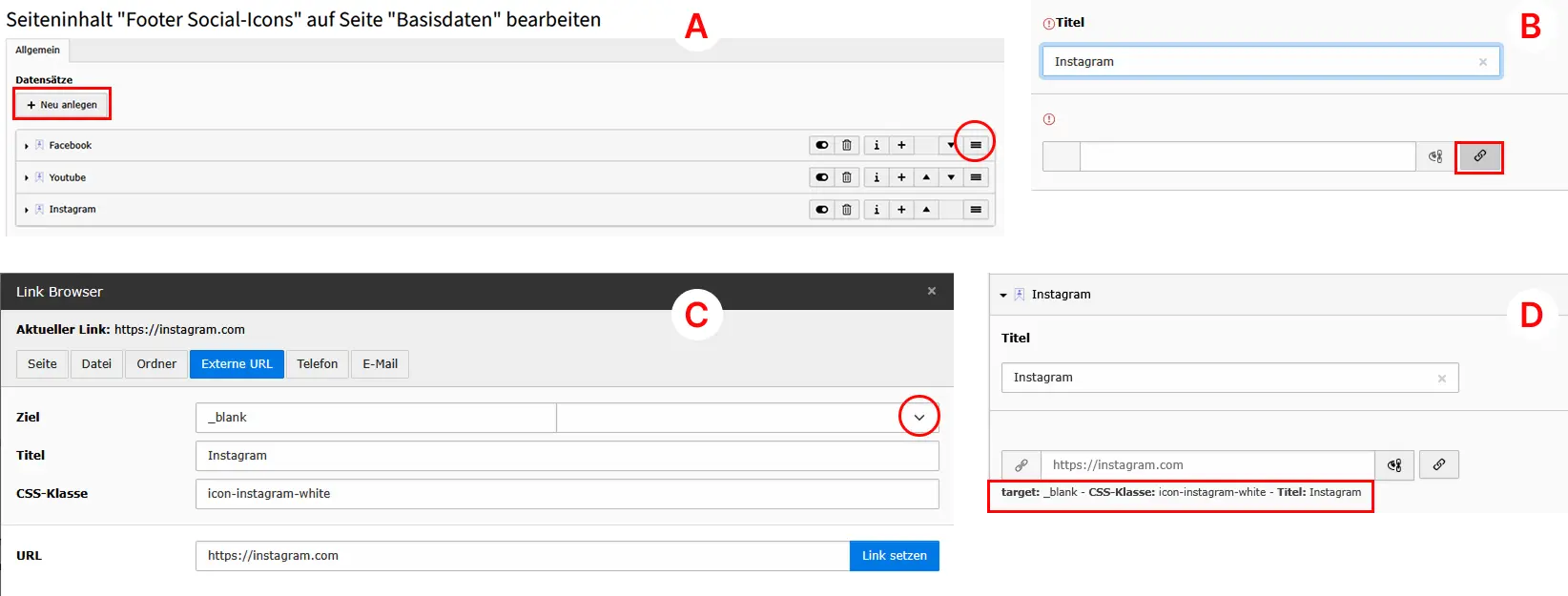 C: Wählen Sie als Ziel “Neues Fenster” aus, tragen Sie dort Titel und URL ein. Wichtig ist der korrekte Eintrag bei “CSS-Klasse” - folgende Services können genutzt werden, siehe Tabelle. Klicken Sie dann auf den Button “Link setzen”