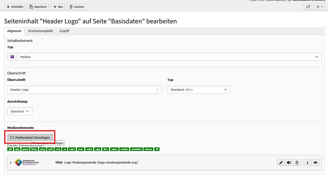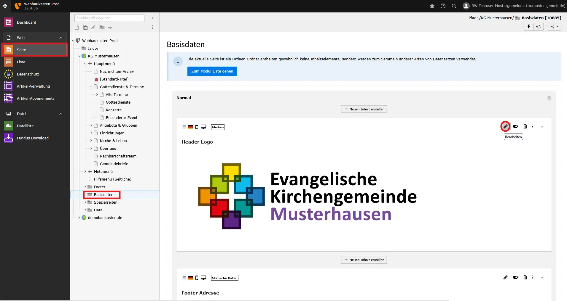 Klicken Sie im Seitenbaum auf den Ordner "Basisdaten". Klicken Sie auf das Stiftsymbol im ersten Element "Header Logo". Löschen Sie bitte NICHT das Element selbst, sondern nur das dort hinterlegte Bild und laden Sie ein neues hoch. Das Logo sollte folgende Maße haben: Format: SVG, PNG, Höhe: 115 px