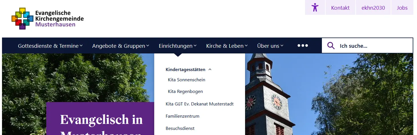 Der Header enthält links oben das individuelle Logo Ihrer Einrichtung, darunter die Hauptnavigation sowie rechts oben eine Meta-Navigation, in die das Barrierefreiheitstool integriert ist.