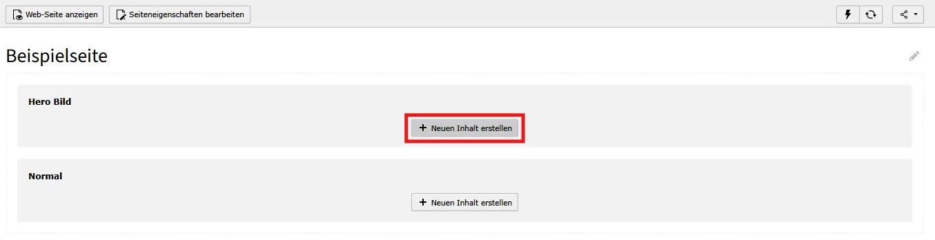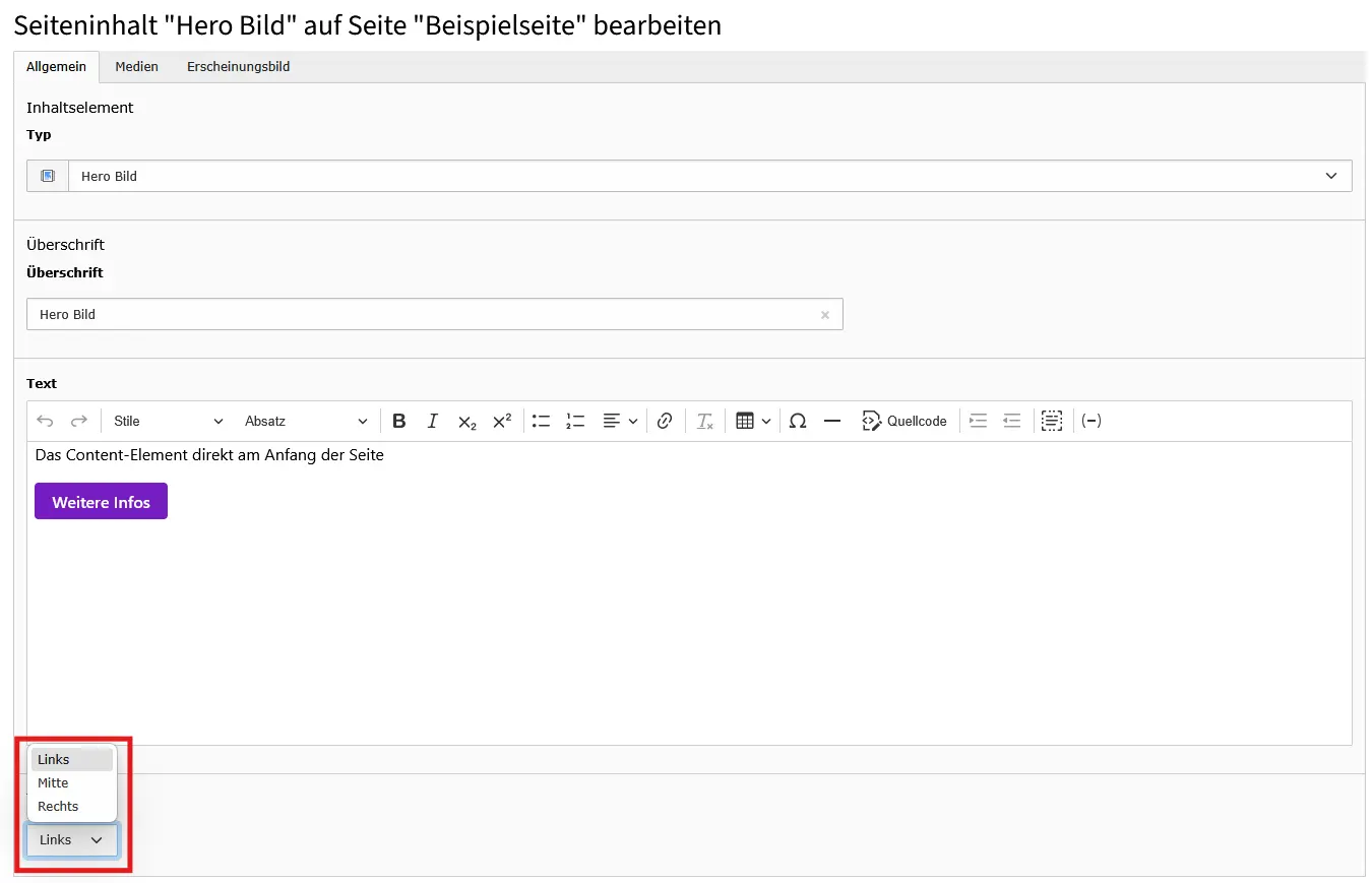 Füllt man das Feld “Überschrift” aus, wird diese im Frontend als Headline vom Typ “H1” ausgegeben. Ebenso kann auch noch ein Text sowie ein Button eingefügt werden. - es handelt sich hier um denselben Text-Editor wie im Content-Element “Text”
