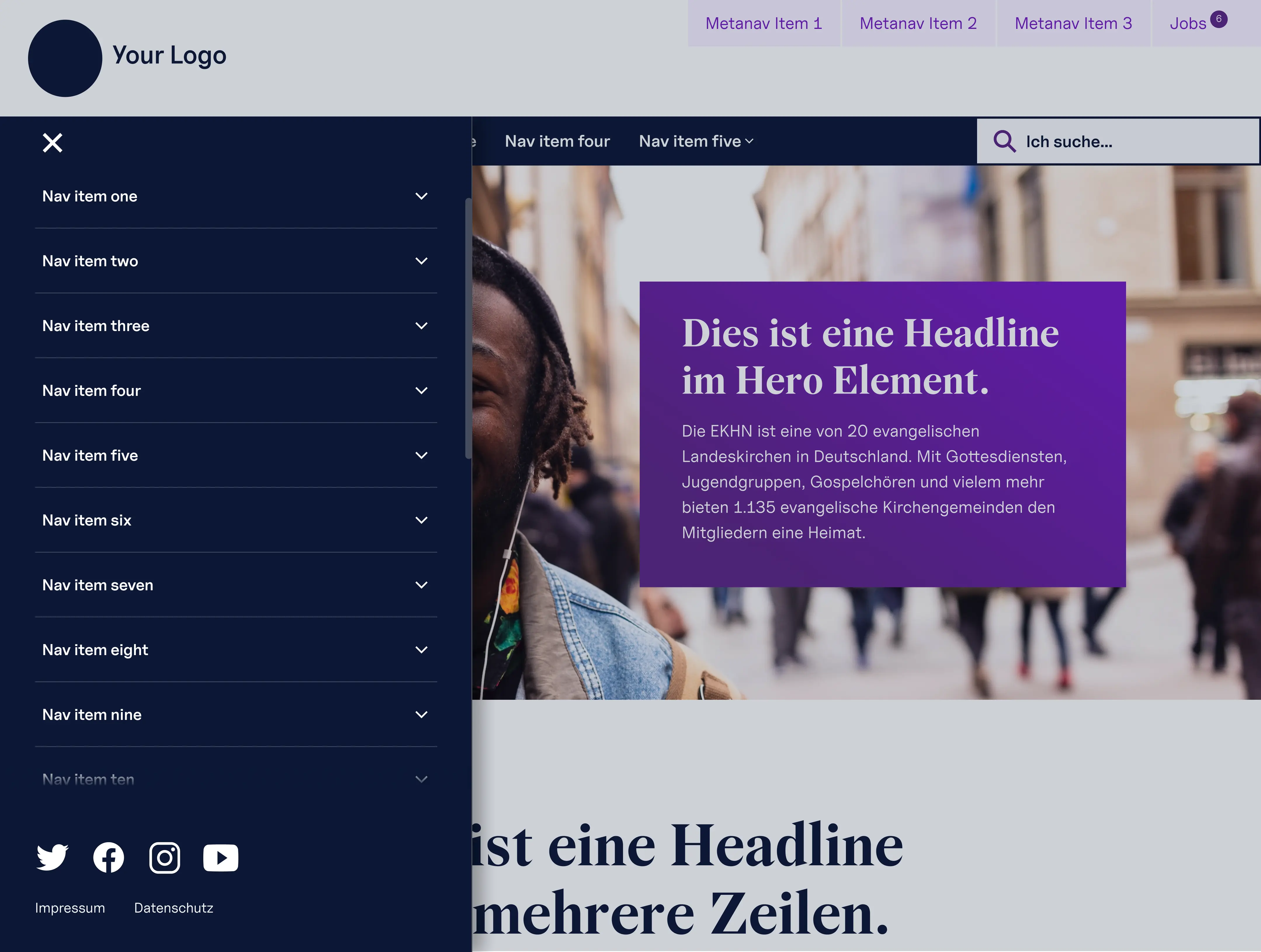 Burger Menü ist nicht redaktionell pflegbar; zusätzliche Punkte fallen automatisch dort rein. Die Navigationspunkte im Hauptmenü werden in der mobilen Darstellung noch einmal wiederholt. In der Desktopansicht greift das Burger Menü die Navigationspunkte auf, welche aus Platzgründen in der Kopfzeile nicht abgebildet werden können.